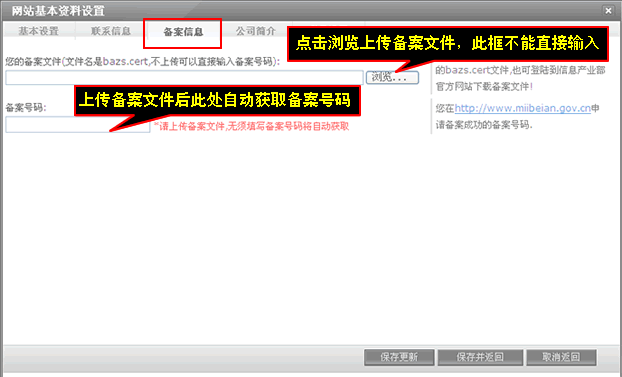 这里主要是上传备案文件(备案文件要登陆到www.miibeian.gov.cn去下载),备案号码在上传好备案文件后自动获取,无需填写,填写完后记得点击“保存更新”。